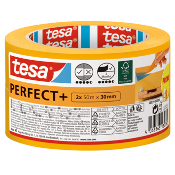 Tesa schilderstape Perfect+ 2 x 50 m 30 mm promo pack is de optimale kwaliteitsoplossing voor schilderprojecten binnenshuis. Voor perfecte, scherpe en strakke verfranden. Hoogwaardige schilderafdekband van extra dun washipapier. De tape is scheurbestendig, hecht aan tal van oppervlakken en kan probleemloos worden verwijderd. De afplaktape kan tot 2 maanden na binnentoepassingen zonder restjes worden verwijderd.