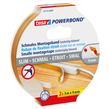 Tesa Powerbond montagetape smal 5 m x 9 mm (2 stuks) is een dubbelzijdige schuimtape met een acryl drager die je binnen gebruikt op verschillende ondergronden. De tape is UV-bestendig en geschikt voor temperaturen tot 40 graden. Je bevestigt er eenvoudig kabelgoten en smalle decoraties mee zonder dat je gereedschap nodig hebt of hoeft te boren.