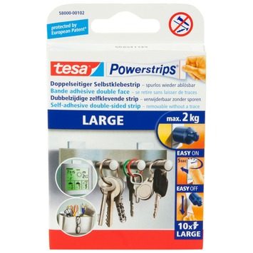 De Tesa Powerstrip strips groot wit (10 stuks) zijn dubbelzijdige kleefstrips die je gebruikt op gladde ondergronden binnen. De drager zorgt voor een sterke kleefkracht zonder boren of schroeven. Deze strips hebben een draagkracht tot 2 kilogram en werken goed op tegels glas hout en plastic. Je verwijdert de strips snel en eenvoudig zonder sporen achter te laten. Deze set bevat tien strips die geschikt zijn voor het hele tesa Powerstrips haakassortiment.