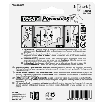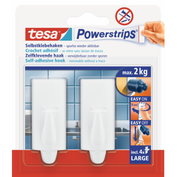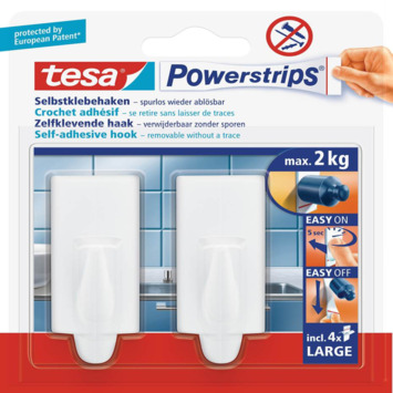 Tesa Powerstrips Haken Large Trend zijn badkamer- en keukenhaken met een trendy look. Het zijn bovendien verwijderbare en herbruikbare haken voor een maximale flexibiliteit. Met hun unieke look passen de haken in elk modern interieur. Het zijn sterke keuken- en badkamerhaken die tot 2 kg kunnen dragen. Ze zijn gemaakt voor een eenvoudige bevestiging en kunnen tegen de muur geplakt worden zonder te boren. Ze zijn zo ontworpen dat je ze kunt verwijderen zonder lijmresten na te laten. Je kan ze zelfs opnieuw gebruiken door een nieuwe Powerstrip aan te brengen.