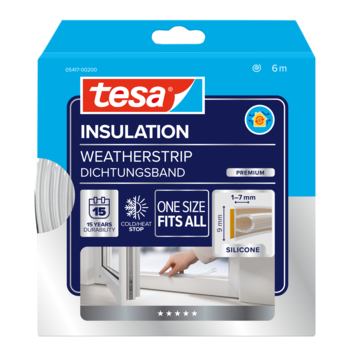 Ga tocht in huis tegen met tochtband van Tesa op ramen, binnen- en buitendeuren. Dit O-profiel is 9 mm breed. Het dicht kieren van 1 tot 7 mm. Met een lengte van 6 meter kan je met één verpakking meerdere ramen netjes afdichten. Knip de strip gemakkelijk met een schaar op maat. Door de zelfklevende strip op de achterzijde van het profiel is het simpel te bevestigen. Omdat de tochtband is gemaakt van siliconen-rubber zal deze minimaal 15 jaar meegaan. Zo zit jij er deze winter dus weer comfortabel bij.