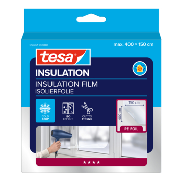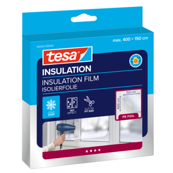 Eenvoudig en voordelig besparen is mogelijk door de Tesa Thermo Cover 6 m². De door Tesa ontwikkelde transparante niet-klevende isolatie voor ramen met enkelglas en biedt een isolerend effect dat als het ware een tweede laag glas kan vervangen. Eenvoudig en onzichtbaar aan te brengen* met de bijgeleverde transparante tape. Met een föhn kan de folie strak tegen het raam geplaatst worden. Bovendien vermindert deze raamisolatie vervelende condensatie van de ramen. Afmetingen: 4 meter x 1,5 meter. Tevens verkrijgbaar bij Gamma in de afmeting 1,7 meter bij 1,5 meter.
