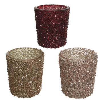 Dit Theelicht glas is een sfeervolle toevoeging. Door de kleine glanzende steentjes aan de buitenkant krijg je een schitterend effect. Verkrijgbaar in rood, goud en zilver. Geschikt voor standaard waxinelichtjes.