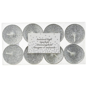 Set theelichten in de kleur zilver glitter, bestaande uit 8 stuks. Ook verkrijgbaar in het goud.