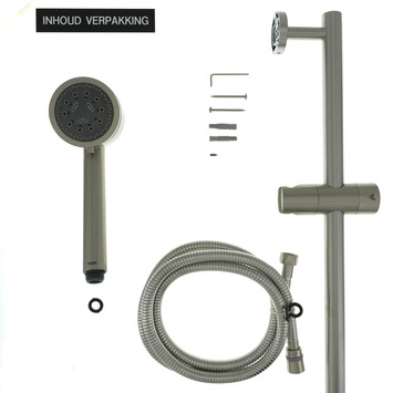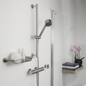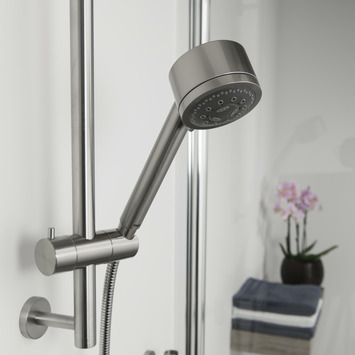 De Tiger Boston Massage doucheset is uitgevoerd in geborsteld RVS, en is ook verkrijgbaar in glanzend RVS. De doucheset bestaat uit een handdouche met RVS finish voorzien van 3 standen en een antikalk functie, een douchestang en een doucheslang van 1,5 meter. De doucheslang is uitrekbaar tot 2 meter, zodra deze los gelaten wordt, is de slang weer 1,5 meter. Tevens voorzien van een antitwist koppeling waardoor uw slang niet opkrult. Er zijn van deze serie diverse douche accessoires verkrijgbaar. Dit product kan aan de wand worden geschroefd, maar kan ook met behulp van Tigerfix 1 op een gladde en harde ondergrond geplakt worden. U hoeft dus niet te boren. (Tigerfix is los verkrijgbaar). Dit product is onderdeel van het Boston totaalconcept, dat verder bestaat uit kranen, badmeubelen, badkamer accessoires en douchecabines, alles in de Boston stijl.