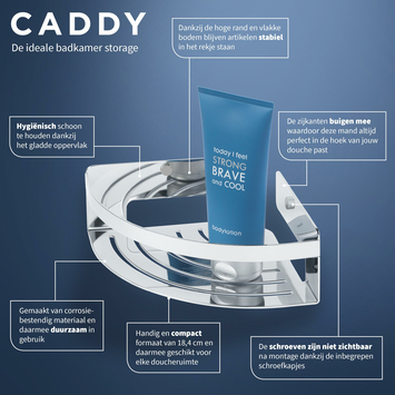 De Tiger Caddy hoekkorf klein chroom heeft een uniek 'fits to size' design. De randen van de hoekkorf sluiten hierdoor perfect aan op de muur, zelfs in die ene hoek die niet haaks is! Deze Caddy hoekkorf is uitgevoerd in verchroomd RVS, maar is ook verkrijgbaar in geborsteld RVS. Tevens verkrijgbaar in anderen afmetingen en modellen. De serie van Tiger Caddy bestaat uit een selectie van korven in verschillende vormen, kleuren en afmetingen.