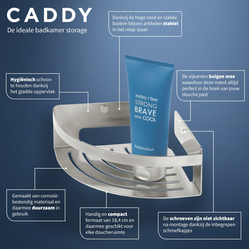 Deze Tiger hoekkorf Caddy klein inox geeft je voldoende ruimte om je douchespullen op te zetten. Zo heb je alles binnen handbereik onder de douche of in bad. Het doucherek is 18 cm breed en 7 cm hoog. Deze hoekkorf is zo ontworpen dat je deze zelfs in moeilijke hoeken goed kunt monteren. De stang voorkomt dat je flessen van het rek vallen.