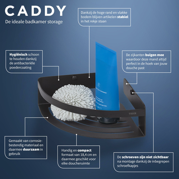 Deze Tiger hoekkorf Caddy zwart klein geeft je voldoende ruimte om je douchespullen op te zetten. Zo heb je alles binnen handbereik onder de douche of in bad. Het doucherek is 18 cm breed en 7 cm hoog. Deze hoekkorf is zo ontworpen dat je deze zelfs in moeilijke hoeken goed kunt monteren. De stang voorkomt dat je flessen van het rek vallen.