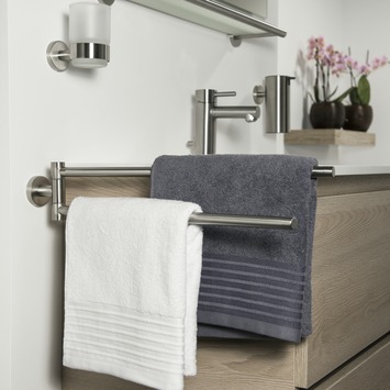 Het Tiger Dubbel Handdoekrek Boston met Draaibare Armen RVS van de accessoire serie Boston is uitgevoerd in geborsteld RVS, en is ook verkrijgbaar in glanzend RVS. Dit product kan uitsluitend worden bevestigd met de meegeleverde schroeven. Er zijn van deze serie diverse sanitair accessoires verkrijgbaar. Dit product maakt deel uit van het Boston totaalconcept, dat verder bestaat uit kranen, badmeubelen, douche accessoires en douchecabines, alles in de Boston stijl.