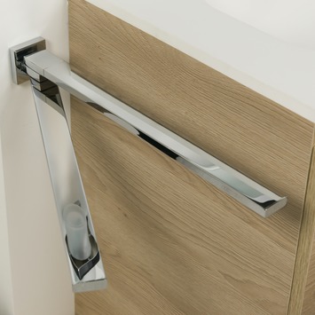 Handig handdoekrek dat je zonder schroeven kunt bevestigen. Moderne uitstraling. Aan de dure kant, maar bij de bouwmarkten wordt regelmatig tot 30% korting gegeven op Tiger artikelen. Een sterk merk.