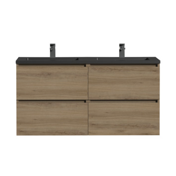 Het greeploze Tiger Karlo badkamermeubel is speciaal ontworpen voor de strakke en moderne badkamer. De wastafelonderkast heeft 2 ruime lades om alle badkamerspullen overzichtelijk in op te bergen. De lades zijn uitgerust met hoogwaardige 'soft close' geleiders waardoor ze geruisloos sluiten. De warme houttint geeft een sfeervol karakter aan het meubel. Daarnaast krijgt het meubel, door de voelbare houtnerf, een mooie natuurlijke uitstraling. De strakke, mat zwarte polybeton wastafel met immitatie natuursteen look maakt deze set compleet.