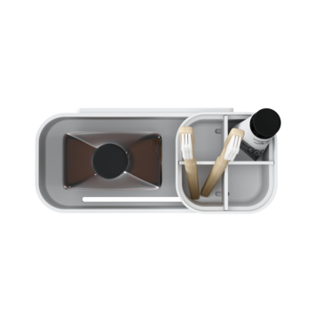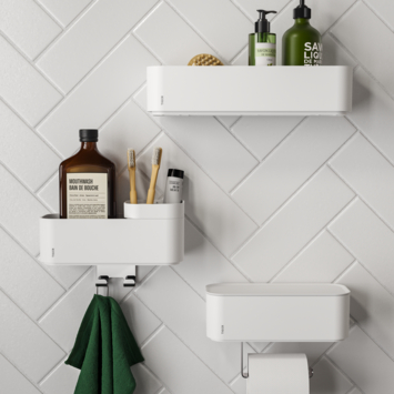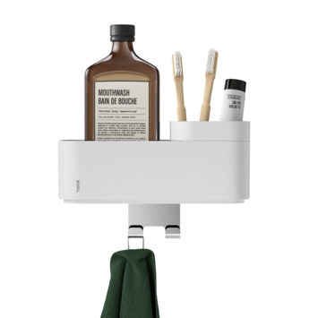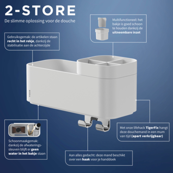 Het Tiger 2-store opbergbakje in het wit is stijlvol, multifunctioneel en een antwoord op al je opbergproblemen. Haak voor je handdoek? Juist. Je tanden poetsen onder douche? Geen probleem. Dit opbergbakje uit de 2-Store serie is jouw antwoord op al je opbergproblemen en kan je zowel bij de wastafel als in de douche plaatsen. Het 2-store opbergbakje is tevens praktisch.Het bakje is goed schoon te houden dankzij de uitneembare inzet en er blijft geen water in het bakje staan dankzij de afwateringsgleuven. Tevens zorgt de stabilisatie aan de achterzijde ervoor de producten recht in het rekje blijven staan.