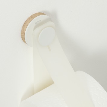 De Tiger Reserverolhouder Urban Wit is uitgevoerd in de kleur mat wit en wordt geleverd met twee decorringen. De decorringen, in de kleur licht eiken en grijs, maken het mogelijk een subtiel kleuraccent toe te voegen. Het is ook mogelijk de toiletrolhouder zonder de decorring te monteren waardoor het zeer eenvoudig is om het product aan de gewenste stijl aan te passen. De flexibele band biedt plaats aan twee extra rollen toiletpapier zodat er altijd voldoende papier beschikbaar is. Bij de montage van het artikel wordt gebruik gemaakt van een muurplaatje waardoor de bijgeleverde bevestigingsmaterialen uit het zicht verdwijnen. De Urban serie bevat tevens een vrijstaande versie van de reserverolhouder, maar ook een groot aantal aanvullende accessoires voor de badkamer en toiletruimte. Alle in dezelfde stijl. De artikelen uit de serie zijn ook in de kleur mat zwart verkrijgbaar, waarbij natuurlijk ook weer diverse decorringen worden meegeleverd. De reserverolhouder is tevens geschikt voor montage met TigerFix type 1, waarmee accessoires snel en eenvoudig op een gladde, harde ondergrond te bevestigen zijn door middel van een gepatenteerd lijmsysteem. Boren is niet noodzakelijk en de accessoires zijn eenvoudig te verwijderen zonder dat er resten op de ondergrond achterblijven. TigerFix is los verkrijgbaar.