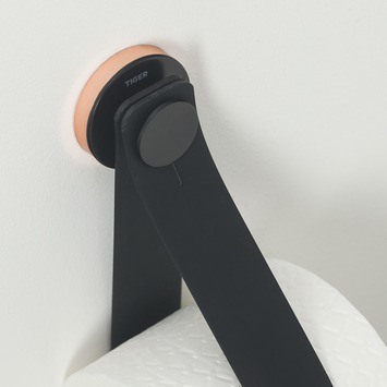 De Tiger Reserverolhouder Urban Zwart is uitgevoerd in de kleur mat zwart en wordt geleverd met twee decorringen. De decorringen, in de kleur licht eiken en grijs, maken het mogelijk een subtiel kleuraccent toe te voegen. Het is ook mogelijk de toiletrolhouder zonder de decorring te monteren waardoor het zeer eenvoudig is om het product aan de gewenste stijl aan te passen. De flexibele band biedt plaats aan twee extra rollen toiletpapier zodat er altijd voldoende papier beschikbaar is. Bij de montage van het artikel wordt gebruik gemaakt van een muurplaatje waardoor de bijgeleverde bevestigingsmaterialen uit het zicht verdwijnen. De Urban serie bevat tevens een vrijstaande versie van de reserverolhouder, maar ook een groot aantal aanvullende accessoires voor de badkamer en toiletruimte. Alle in dezelfde stijl. De artikelen uit de serie zijn ook in de kleur mat wit verkrijgbaar, waarbij natuurlijk ook weer diverse decorringen worden meegeleverd. De reserverolhouder is tevens geschikt voor montage met TigerFix type 1, waarmee accessoires snel en eenvoudig op een gladde, harde ondergrond te bevestigen zijn door middel van een gepatenteerd lijmsysteem. Boren is niet noodzakelijk en de accessoires zijn eenvoudig te verwijderen zonder dat er resten op de ondergrond achterblijven. TigerFix is los verkrijgbaar.