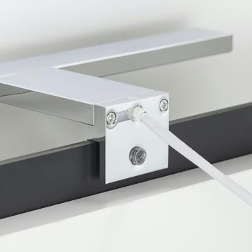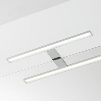 De Tiger LED-lamp Aurel is een strakke, moderne designlamp. Door de breedte van de lamp is deze uitermate geschikt om boven de wastafelspiegel te hangen. De lamp kan op 2 manieren gemonteerd worden; zowel op het meubel als op de spiegel. De lamp is uitgevoerd in de kleur chroom. De lamp is voorzien van 8,4 watt LED verlichting met geïntegreerde transformator. De lichtkleur is 4000K.