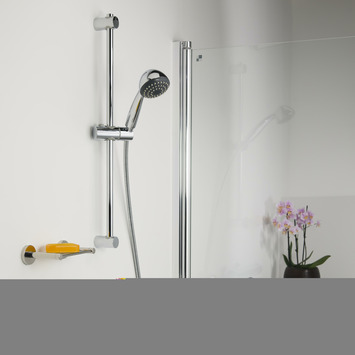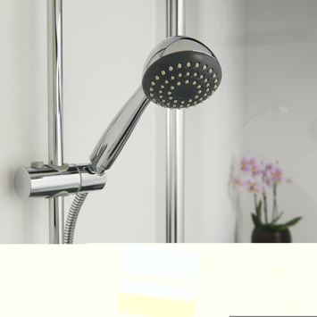 De doucheset Murcia van Tiger bestaat uit een handdouche, doucheslang en -stang met handdouchehouder en verstelbare muursteunen. De handdouche heeft een diameter van 8,5 cm. De ronde en bolle douchekop geeft een retro-look en is uitgevoerd in chroom. Door de siliconen nopjes kan je kalk makkelijk met de hand afvegen. Door de toepassing van Neoperl® technologie bespaar je tot 40% water. Deze technologie zorgt er met een dynamische o-ring voor dat er altijd een constante hoeveelheid water doorgelaten wordt. Bij een hoge druk wordt veel water bespaard, bij lage druk wordt het comfort juist verhoogd door lucht toe te voegen aan het uitstromende water. Je bespaart dus water en je doucht altijd comfortabel. Met de handdouchehouder stel je eenvoudig de hoogte van de douche in. Door de siliconen nopjes kan je kalk makkelijk met de hand afvegen. Doordat 1 muursteun verstelbaar is, kun je de set over je oude boorgaten vastschroeven. De doucheslang heeft een universele 1/2"aansluiting en past op elke douchekraan. Dit product is onderdeel van het Splash eco assortiment: een Tiger lijn met waterbesparende producten.