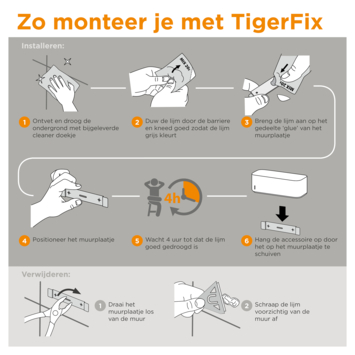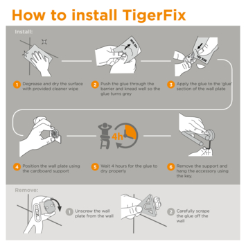 Met TigerFix zijn Tiger accessoires snel en eenvoudig op een gladde, harde ondergrond te bevestigen door middel van een gepatenteerd lijmsysteem. Je badkamer verfraaien met Tiger accessoires was nog nooit zo eenvoudig. Na het mixen van de lijm kan deze eenvoudig op het muurplaatje worden aangebracht en na 4 uur kun je het accessoire plaatsen. Zo simpel is het! Wil je geen gaten boren in je nieuwe badkamertegels, zeker niet in natuursteen of grote tegels? Dan is TigerFix de oplossing. Deze gepatenteerde manier van monteren garandeert een zeer krachtige lijmverbinding op iedere gladde, stevige ondergrond. Groot voordeel van TigerFix is dat het muurplaatje eenvoudig, zonder beschadigingen, te verwijderen is. Handig bij huurwoningen, verhuizen of gewoon wanneer je accessoires wilt verplaatsen. TigerFix is geschikt voor nagenoeg alle accessoires uit de Tiger series en kun je herkennen aan het Tigerfix symbool op de verpakking.