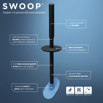Deze blauwe wc-borstelhouder van Tiger Tess is de held van de sanitaire ruimte. Hij is ontworpen om jouw badkamer en toilet te voorzien van meer gemak. Snel even het toilet schoonmaken? Geen probleem, deze toiletborstelhouder heeft een handig opbergvak voor een fles toiletreiniger. Na gebruik zet je hem weer eenvoudig terug in het compartiment. Draai hem om en hij staat uit het zicht. Zo eenvoudig kan het zijn. Deze houder is voorzien van de nieuwe Swoop® flexibele toiletborstel. Met deze innovatieve borstelkop reinig je met gemak moeilijk bereikbare plekken en dankzij de vorm en het speciale materiaal van de borstel blijft er geen viezigheid achter en druppelt hij nauwelijks na als je hem terug in de houder plaatst. Tiger Tess is innovatief en eigentijds met de herkenbare kwaliteit van Tiger.