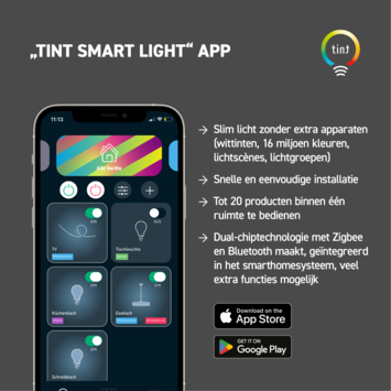 De Tint Smart LED Wandlamp Malva RGBW 7W combineert stijlvol design met slimme technologie voor sfeervolle buitenverlichting. Dankzij het up-down ontwerp met twee lichtkringen verlicht de lamp zowel omhoog als omlaag, ideaal voor gevels, terrassen en balkons. De geïntegreerde LED’s bieden wit licht van extra warm (1800K) tot koel daglicht (6500K), én gekleurd licht met keuze uit 16 miljoen Tinten. De lamp is traploos dimbaar en spatwaterdicht (IP44), met een robuuste aluminium behuizing in antraciet (RAL7016). Bedien de lamp via de gratis Tint Smart Light app (Bluetooth) of met de Tint afstandsbediening (apart verkrijgbaar). Dankzij Zigbee 3.0 is integratie in populaire smart home systemen zoals Philips Hue, Magenta SmartHome en Samsung SmartThings mogelijk. Ook spraakbesturing via Amazon Alexa (Echo met Zigbee) wordt ondersteund.