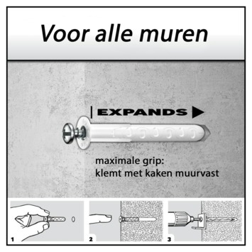 De kunststof Toggler-alligatorplug AF6 heeft een diameter van 6mm en koopt u per 6 stuks. U gebruikt de alligatorplug met kraag voor het stevig bevestigen van voorwerpen in beton, gasbeton, gipsblokken, kalkzandsteen en baksteen. De Toggler-plug heeft een boormaat van 6mm en wanneer u in tegel boort een maat van 8mm. De 6mm-plug is maximaal te belasten met 288kg, afhankelijk van het materiaal. Deze supersterke montage heeft de alligatorplug AF6 te danken aan zijn speciale vorm. Naast het feit dat de alligatorplug erg krachtig is, is de plug ook ideaal om te gebruiken voor bijvoorbeeld materialen met een stuclaag of te grote boorgaten. De alligatorplug van Toggler draait namelijk niet met de schroef mee dankzij de anti-rotatievleugels. Zelfs als het boorgat te groot is, schroeft u de schroef probleemloos in de plug en zorgt u voor een stevige bevestiging. De schroefmaat is 35mm tot maximaal 50mm, met een minimale lengte van 35mm plus de materiaaldikte. Met de 6mm alligatorplug hangt u bijvoorbeeld keukenkasten en badkamermeubels op, zoals douchedeuren, maar ook keukenkasten en flatscreens. De verpakking bevat 6 alligatorpluggen AF6 van Toggler.