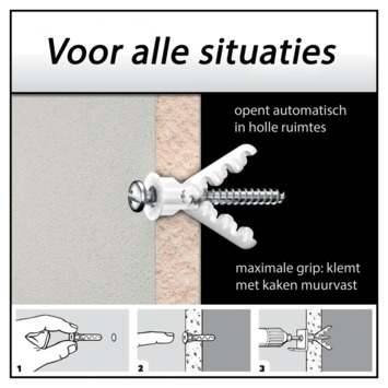 De kunststof Toggler-alligatorplug AF8 heeft een diameter van 8mm en koopt u per 20 stuks. U gebruikt de alligatorplug met kraag voor het stevig bevestigen van voorwerpen in beton, gasbeton, gipsblokken, kalkzandsteen en baksteen. De Toggler-plug heeft een boormaat van 8mm en wanneer u in tegel boort, is een maat van 10mm vereist. De 8mm-plug is maximaal te belasten met 396kg, afhankelijk van het materiaal. Deze supersterke montage heeft de alligatorplug AF8 te danken aan zijn speciale vorm. Naast het feit dat de alligatorplug erg krachtig is, is de plug ook ideaal om te gebruiken voor bijvoorbeeld materialen met een stuclaag of te grote boorgaten. De alligatorplug van Toggler draait namelijk niet met de schroef mee dankzij de anti-rotatievleugels. Zelfs als het boorgat te groot is, schroeft u de schroef probleemloos in de plug en zorgt u voor een stevige bevestiging. De schroefmaat is 40mm tot maximaal 60mm, met een minimale lengte van 45mm plus de materiaaldikte. Met de 8mm lange alligatorplug hangt u bijvoorbeeld keukenkasten en badkamermeubels op, zoals douchedeuren, maar ook keukenkasten en flatscreens. De verpakking bevat 20 alligatorpluggen AF8 van Toggler.