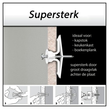 De Toggler-hollewandplug TB-20, 20 stuks, gebruikt u voor het bevestigen van voorwerpen in plaatmateriaal, zoals gipsplaten of hout- en vezelplaten, van 9mm tot 13mm dik. Een hollewandplug (tuimelplug) heeft grote anti-rotatievleugels waardoor de plug niet meedraait wanneer u er een schroef indraait. U monteert de plug in holle wanden met behulp van de bijgeleverde doordrukpen. Hierdoor is montage van de plug eenvoudig en snel voor elkaar. De 9mm- tot 13mm-hollewandplug heeft een groot draagvlak achter de plaat en biedt daardoor veel houvast. U kunt de pluggen dan ook tot wel 70kg belasten, afhankelijk van het materiaal. Met de hollewandplug TB-20 bevestigt u bijvoorbeeld kasten of keukenapparatuur. Deze voorwerpen bevestigt u in combinatie met voldraadschroeven van 3,5mm tot 6mm dikte en een minimale lengte van 26mm plus de dikte van het materiaal. U gebruikt een boormaat van 8mm. De verpakking bevat 20 TB-20-hollewandpluggen van Toggler.