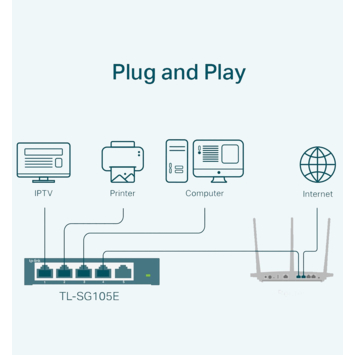 Koppel apparaten, makkelijk zaken doen Met de TP-Link TL-SG105E desktop-switch kun je eenvoudig de snelheid van de netwerkserver en backbone-verbindingen verhogen. Of je nu thuis of op kantoor bent, de TL-SG105E helpt je om zaken snel en eenvoudig af te handelen. De switch bevat 5-poorten, let op 1 poort gebruik je voor de aansluiting. Heb je te weinig poorten, kies dan voor een switch met 8 of meer poorten. Meer functies, meer keuzemogelijkheden Beheerders kunnen prioriteiten aan het verkeer toewijzen op basis van QoS, zodat spraak- en videotoepassingen altijd helder en lag-vrij verlopen. IGMP Snooping optimaliseert het multimediaverkeer, zodat het netwerk beter presteert. Dit is met name nuttig voor toepassingen zoals IPTV.