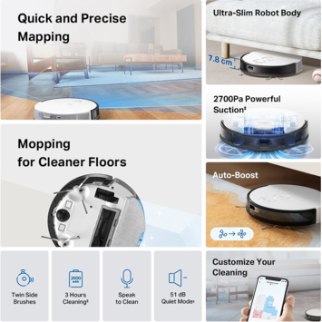Ultraslank Ontwerp van 7,8 cm Dankzij het ultraslanke ontwerp van slechts 7,8 cm rijdt de TP-Link Tapo RV20 moeiteloos onder meubels door om verborgen stof en vuil te verwijderen. Aangepaste Reiniging Voeg ruimten samen of scheid ze, stel een reinigingsschema in en maak aangepaste reinigingsmodi voor elke ruimte. De TP-Link Tapo RV20 biedt volledige flexibiliteit in je schoonmaakroutine. Met een geluidsniveau van slechts 51 dB reinigt de TP-Link Tapo RV20 je huis zonder jou of je huisdieren te storen. Ondersteuning van OTA-updates Houd je robotstofzuiger up-to-date met de laatste firmwareversie via de Tapo app. Geniet van een betere ervaring en meer functies in de toekomst.