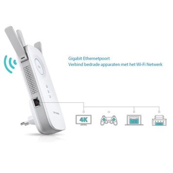 Met deze TP-Link RE450 wifi versterker vergroot je eenvoudig het dekkingsgebied en de signaalsterkte van een bestaand draadloos netwerk. Zo helpt de range extender "dode zones" te elimineren. De RE450 maakt gebruik van de Wireless AC wifi-standaard waardoor hij gecombineerde draadloze snelheden kan leveren tot 1750 Mbps, waarvan 450 op de 2,4 Ghz frequentieband en 1300 Mbps op de 5 GHz frequentieband.