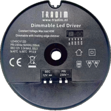 De Tradim 12V Dimbare Led Driver Rond is een compacte voeding voor 12V LED-lampen en LED-strips. Je kunt hem zien als het “hart” dat je lampen van de juiste stroom voorziet. Hij vervangt eenvoudig een oude halogeentrafo en zorgt ervoor dat je LED-verlichting veilig en goed dimbaar werkt.