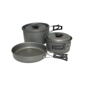 De Travellife pannenset 3-delig bestaat uit 2 kookpannen en 1 bakpan. Alle pannen hebben een bijpassend deksel met gaten, zodat je het voedsel eenvoudig kunt afgieten. De handgrepen van de pannen zijn in te klappen en de hele set is gemakkelijk in elkaar te stapelen. Daardoor is de pannenset compact te vervoeren. Inhoud: kookpan groot 16x10cm, kookpan klein 14x7cm en bakpan 17x4cm.