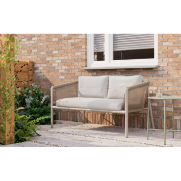 De tuinbank Lugo is een metalen tuinbank met stoffen kussens, geschikt voor twee personen. Je gebruikt de beige tuinbank als vaste zitplek in de tuin, op het terras of onder een overkapping om even te zitten, te lezen of samen buiten te zijn.
