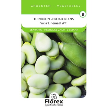 Tuinboon (Vicia, Driemaal Wit) Heerlijke zachte smaak. Witbloeiend ras waarvan de bonen ook gekookt wit blijven. De Tuinboon Zaadjes bloeien in Februari, Maart, April, Mei. Dit is een Eenjarig plant Deze zaadjes kunnen gepland worden in Februari, Maart, April, Mei en ontkiemen in dagen.