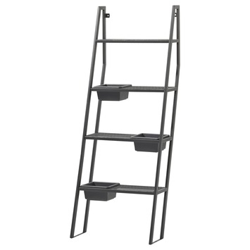 Het is eenvoudig in elkaar te zetten. Het moet met 4 schroeven vast gezet worden zowel aan de muur als aan de grond. Dat laatste heb ik niet gedaan en daarvoor in de plaats heb ik 2 rubberen doppen geplaatst zodat de onderzijde niet door de stenen wordt beschadigd. En zo staat het rek ook stevig.