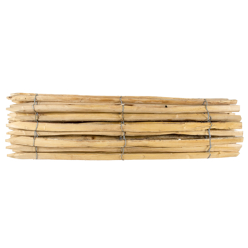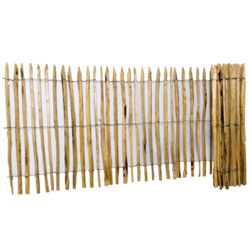 Het hek is opgebouwd uit gepunte kastanje latten die op drie punten aan elkaar zijn bevestigd met gevlochten verzinkte ijzerdraad. Deze constructie maakt het hek stevig maar toch flexibel, zodat het eenvoudig kan worden aangepast aan de vormen en contouren van je tuin. Het natuurlijke materiaal geeft het geheel een rustieke en harmonieuze uitstraling die mooi samengaat met planten en andere tuinmaterialen.
