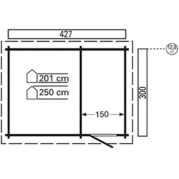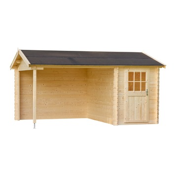 Blokhut Celmatis met overkapping van Noord Europees vurenhout, wanddikte 28mm. Overkapping is voorzien van verstelbare paalvoet en naar keuze links of rechts aan te bouwen. Afmeting 4270x3000x2500mm (bxdxh*). Enkele deur (790x1740mm) met kunststofglas. Dakhout met messing en groef in 16mm dikte. Een houten vloer met messing en groef in 19mm dikte en voorzien van geïmpregneerde vloerbalken (40x60mm) is optioneel bestelbaar. Deze stapelbouw blokhut is voorzien van de zeer sterke en stabiele 4 plus hoekverbinding en wordt standaard geleverd inclusief dakleer, dakverankering, hang en sluitwerk en een duidelijke opbouwbeschrijving.