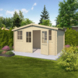 Naast de deur zit een vast raam dat zorgt voor extra lichtinval in het tuinhuis. Dit raam kan niet geopend worden. De latten voor de 4-vlaks raamverdeling in de deur worden los meegeleverd. Het zadeldak geeft het tuinhuis een herkenbare uitstraling. De montage is goed te doen voor de gemiddelde klusser dankzij de traditionele stapelbouw. Het dak wordt geleverd met een basis bitumen dakbedekking die vooral geschikt is voor tijdelijk gebruik.