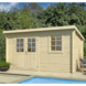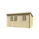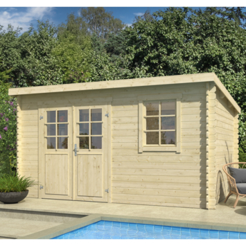 Het tuinhuis is uitgevoerd in onbehandeld vurenhout met geschaafde afwerking. De massieve wandbalken van 28 mm dik worden opgebouwd met een traditionele stapelbouwconstructie, wat zorgt voor een duidelijke en logische montage. De voorwand kan gespiegeld worden gemonteerd, zodat het raam links van de dubbele deur komt. Het draai-kiep raam opent naar binnen toe en kan zowel kantelend als draaiend gebruikt worden. De latten voor de 6-vlaks raamverdeling in de deur worden los meegeleverd. Het schuin dak is geschikt om af te werken met EPDM dak folie, zoals geadviseerd voor langdurig gebruik. Alle aangegeven maatvoeringen zijn circa maten.