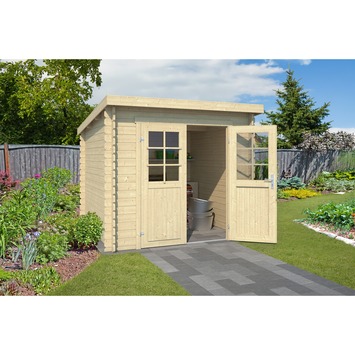 Dit tuinhuis is gemaakt uit geschaafd, maar verder onbehandeld Noord-Europees vurenhout. Dat vergt wat meer onderhoud dan gedompeld of geïmpregneerd hout of hout met een coating. Onbehandeld hout dien je namelijk zelf een goede basis te geven door het te behandelen. Daarna dien je het uiteraard, net als met voor behandeld hout, regelmatig te onderhouden om de levensduur van het huisje te verlengen. Het tuinhuisje impregneer, beits of verf je zowel aan de buiten- als binnenkant. Extra aandacht dien je te besteden aan deuren en ramen, want die zijn veruit het meest kwetsbaar. Het voordeel van onbehandeld hout is dat je zelf kan kiezen hoe je het wil afwerken en in welke kleur.