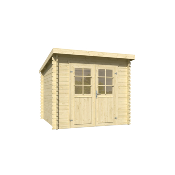De wanden zijn 28 mm dik en opgebouwd met een stapelbouwmethode. Hierdoor plaats je het tuinhuis laag voor laag zonder steunpilaren. De dubbele deuren zijn voorzien van glas en een cilinderslot. Het schuin aflopende dak dient afgewerkt te worden met EPDM dakfolie of shingles. Alle opgegeven maatvoeringen zijn circa maten.