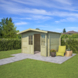 Het tuinhuis heeft afsluitbare dubbele deuren met een lage dorpel, waardoor je makkelijk naar binnen loopt met grotere spullen. De latten voor de 4-vlaks raamverdeling op de ruit in de deur worden los meegeleverd. Door de stapelbouw is de montage overzichtelijk en goed uitvoerbaar voor de gemiddelde klusser. Voor het dak is een basis bitumen dakbedekking inbegrepen. Deze is vooral bedoeld voor tijdelijk gebruik. Voor een betere afwerking wordt geadviseerd het dak af te werken met dakshingles, verkrijgbaar in 3 kleuren. Alle opgegeven maten zijn circa maten.