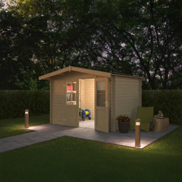 - Exclusief bijbehorende accessoires: vloer of funderingsbalken, dakgootset en dakshingles