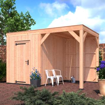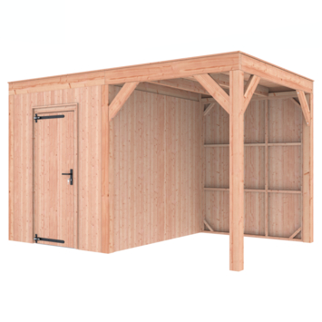 Dit modern vormgegeven tuinverblijf biedt een perfecte balans tussen uitstraling en functionaliteit. De totale afmetingen zijn 245 cm hoog, 395 cm breed en 255 cm diep. De berging heeft een breedte van 178,5 cm met een deur van 75cm x192,5cm.De overkapping heeft een breedte van 178,5 cm en een doorloophoogte van 224 cm.Of je nu een gezellige loungehoek, een opslagruimte of een overdekte plek voor tuinfeestjes zoekt, dit Douglas tuinverblijf is een aanwinst voor iedere tuin.Natuurlijke uitstraling, degelijke kwaliteit.De wanden zijn bekleed met Half houts rabat en de constructie is gemaakt van onbehandeld Douglas met stevige staanders van 12x12cm.De keuze voor onbehandeld Douglas hout biedt een authentieke uitstraling en staat ook garant voor een lange levensduur.Functies:Door een overkapping mét opslag te kiezen, heb je een praktische ruimte om bijvoorbeeld tuingereedschap of fietsen op te slaan en af te sluiten, maar ook voor een ruimte om heerlijk beschut te ontspannen in uw eigen tuin. Het beste van 2 werelden!Klaar voor een groene toekomst:Dit modern vormgegeven tuinverblijf is speciaal ontworpen om zonnepanelen of een sedum dak te kunnen ondersteunen, Hierdoor is dit verblijf een duurzame en milieuvriendelijke aanvulling op uw tuin is.Zelf aan de slagDankzij de duidelijke opbouwomschrijving, meegeleverde bevestigingsmaterialen en op maat gezaagde onderdelen, is de installatie van dit tuinhuis een haalbare klus voor iedere gemiddelde doe-het-zelver. Dak bekleding:Wij raden aan om deze Douglas overkapping te voorzien van een EPDM Dak bekleding voor een lekvrij dak (Let op: los bij te bestellen).Onderhoud:Bij het kopen van een overkapping is onderhoud een aandachtspunt… Met Douglas hout heb je het goed voor elkaar, Douglas is namelijk van zichzelf al een sterke houtsoort. Het gaat zonder extra behandeling eenvoudig 10 tot 15 jaar mee. Om de maximale levensduur te verlengen kun je gebruik maken van speciale Douglas beits of Douglas olie en elke 2 jaar opnieuw beitsen of oliën.