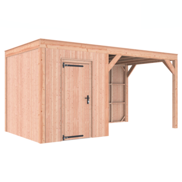 Dit modern vormgegeven tuinverblijf biedt een perfecte balans tussen uitstraling en functionaliteit. De totale afmetingen zijn 245 cm hoog, 495 cm breed en 255 cm diep. De berging heeft een breedte van 278,5 cm met een deur van 75cm x192,5cm.De overkapping heeft een breedte van 178,5 cm en een doorloophoogte van 224 cm.Of je nu een gezellige loungehoek, een opslagruimte of een overdekte plek voor tuinfeestjes zoekt, dit Douglas tuinverblijf is een aanwinst voor iedere tuin.Natuurlijke uitstraling, degelijke kwaliteit.De wanden zijn bekleed met Half houts rabat en de constructie is gemaakt van onbehandeld Douglas met stevige staanders van 12x12cm.De keuze voor onbehandeld Douglas hout biedt een authentieke uitstraling en staat ook garant voor een lange levensduur.Functies:Door een overkapping mét opslag te kiezen, heb je een praktische ruimte om bijvoorbeeld tuingereedschap of fietsen op te slaan en af te sluiten, maar ook voor een ruimte om heerlijk beschut te ontspannen in uw eigen tuin. Het beste van 2 werelden!Klaar voor een groene toekomst:Dit modern vormgegeven tuinverblijf is speciaal ontworpen om zonnepanelen of een sedum dak te kunnen ondersteunen, Hierdoor is dit verblijf een duurzame en milieuvriendelijke aanvulling op uw tuin is.Zelf aan de slagDankzij de duidelijke opbouwomschrijving, meegeleverde bevestigingsmaterialen en op maat gezaagde onderdelen, is de installatie van dit tuinhuis een haalbare klus voor iedere gemiddelde doe-het-zelver. Dak bekleding:Wij raden aan om deze Douglas overkapping te voorzien van een EPDM Dak bekleding voor een lekvrij dak (Let op: los bij te bestellen).Onderhoud:Bij het kopen van een overkapping is onderhoud een aandachtspunt… Met Douglas hout heb je het goed voor elkaar, Douglas is namelijk van zichzelf al een sterke houtsoort. Het gaat zonder extra behandeling eenvoudig 10 tot 15 jaar mee. Om de maximale levensduur te verlengen kun je gebruik maken van speciale Douglas beits of Douglas olie en elke 2 jaar opnieuw beitsen of oliën.
