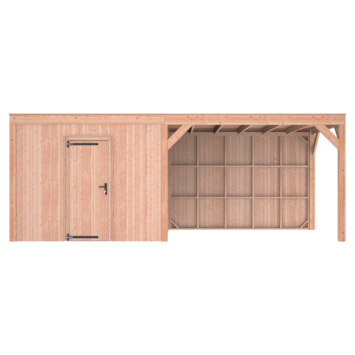 Dit modern vormgegeven tuinverblijf biedt een perfecte balans tussen uitstraling en functionaliteit. De totale afmetingen zijn 245 cm hoog, 645 cm breed en 255 cm diep. De berging heeft een breedte van 328,5 cm met een deur van 75cm x192,5cm.De overkapping heeft een breedte van 278,5 cm en een doorloophoogte van 224 cm.Of je nu een gezellige loungehoek, een opslagruimte of een overdekte plek voor tuinfeestjes zoekt, dit Douglas tuinverblijf is een aanwinst voor iedere tuin.Natuurlijke uitstraling, degelijke kwaliteit.De wanden zijn bekleed met Half houts rabat en de constructie is gemaakt van onbehandeld Douglas met stevige staanders van 12x12cm.De keuze voor onbehandeld Douglas hout biedt een authentieke uitstraling en staat ook garant voor een lange levensduur.Functies:Door een overkapping mét opslag te kiezen, heb je een praktische ruimte om bijvoorbeeld tuingereedschap of fietsen op te slaan en af te sluiten, maar ook voor een ruimte om heerlijk beschut te ontspannen in uw eigen tuin. Het beste van 2 werelden!Klaar voor een groene toekomst:Dit modern vormgegeven tuinverblijf is speciaal ontworpen om zonnepanelen of een sedum dak te kunnen ondersteunen, Hierdoor is dit verblijf een duurzame en milieuvriendelijke aanvulling op uw tuin is.Zelf aan de slagDankzij de duidelijke opbouwomschrijving, meegeleverde bevestigingsmaterialen en op maat gezaagde onderdelen, is de installatie van dit tuinhuis een haalbare klus voor iedere gemiddelde doe-het-zelver. Dak bekleding:Wij raden aan om deze Douglas overkapping te voorzien van een EPDM Dak bekleding voor een lekvrij dak (Let op: los bij te bestellen).Onderhoud:Bij het kopen van een overkapping is onderhoud een aandachtspunt… Met Douglas hout heb je het goed voor elkaar, Douglas is namelijk van zichzelf al een sterke houtsoort. Het gaat zonder extra behandeling eenvoudig 10 tot 15 jaar mee. Om de maximale levensduur te verlengen kun je gebruik maken van speciale Douglas beits of Douglas olie en elke 2 jaar opnieuw beitsen of oliën.