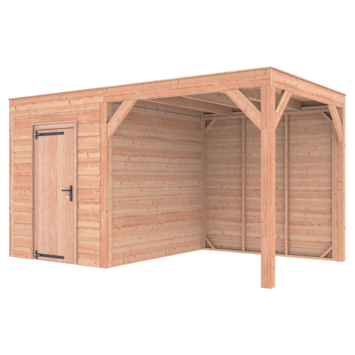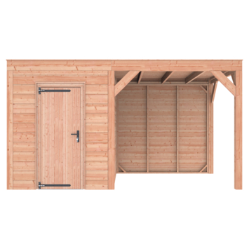Dit modern vormgegeven tuinverblijf biedt een perfecte balans tussen uitstraling en functionaliteit. De totale afmetingen zijn 245 cm hoog, 445 cm breed en 255 cm diep. De berging heeft een breedte van 228,5 cm met een deur van 75cm x192,5cm.De overkapping heeft een breedte van 178,5 cm en een doorloophoogte van 224 cm.Of je nu een gezellige loungehoek, een opslagruimte of een overdekte plek voor tuinfeestjes zoekt, dit Douglas tuinverblijf is een aanwinst voor iedere tuin.Natuurlijke uitstraling, degelijke kwaliteit.De wanden zijn bekleed met Douglas Zweeds rabat en de constructie is gemaakt van onbehandeld Douglas met stevige staanders van 12x12cm.De keuze voor onbehandeld Douglas hout biedt een authentieke uitstraling en staat ook garant voor een lange levensduur.Functies:Door een overkapping mét opslag te kiezen, heb je een praktische ruimte om bijvoorbeeld tuingereedschap of fietsen op te slaan en af te sluiten, maar ook voor een ruimte om heerlijk beschut te ontspannen in uw eigen tuin. Het beste van 2 werelden!Klaar voor een groene toekomst:Dit modern vormgegeven tuinverblijf is speciaal ontworpen om zonnepanelen of een sedum dak te kunnen ondersteunen, Hierdoor is dit verblijf een duurzame en milieuvriendelijke aanvulling op uw tuin is.Zelf aan de slagDankzij de duidelijke opbouwomschrijving, meegeleverde bevestigingsmaterialen en op maat gezaagde onderdelen, is de installatie van dit tuinhuis een haalbare klus voor iedere gemiddelde doe-het-zelver. Dak bekleding:Wij raden aan om deze Douglas overkapping te voorzien van een EPDM Dak bekleding voor een lekvrij dak (Let op: los bij te bestellen).Onderhoud:Bij het kopen van een overkapping is onderhoud een aandachtspunt… Met Douglas hout heb je het goed voor elkaar, Douglas is namelijk van zichzelf al een sterke houtsoort. Het gaat zonder extra behandeling eenvoudig 10 tot 15 jaar mee. Om de maximale levensduur te verlengen kun je gebruik maken van speciale Douglas beits of Douglas olie en elke 2 jaar opnieuw beitsen of oliën.