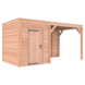 Dit modern vormgegeven tuinverblijf biedt een perfecte balans tussen uitstraling en functionaliteit. De totale afmetingen zijn 245 cm hoog, 495 cm breed en 255 cm diep. De berging heeft een breedte van 278,5 cm met een deur van 75cm x192,5cm.De overkapping heeft een breedte van 178,5 cm en een doorloophoogte van 224 cm.Of je nu een gezellige loungehoek, een opslagruimte of een overdekte plek voor tuinfeestjes zoekt, dit Douglas tuinverblijf is een aanwinst voor iedere tuin.Natuurlijke uitstraling, degelijke kwaliteit.De wanden zijn bekleed met Douglas Zweeds rabat en de constructie is gemaakt van onbehandeld Douglas met stevige staanders van 12x12cm.De keuze voor onbehandeld Douglas hout biedt een authentieke uitstraling en staat ook garant voor een lange levensduur.Functies:Door een overkapping mét opslag te kiezen, heb je een praktische ruimte om bijvoorbeeld tuingereedschap of fietsen op te slaan en af te sluiten, maar ook voor een ruimte om heerlijk beschut te ontspannen in uw eigen tuin. Het beste van 2 werelden!Klaar voor een groene toekomst:Dit modern vormgegeven tuinverblijf is speciaal ontworpen om zonnepanelen of een sedum dak te kunnen ondersteunen, Hierdoor is dit verblijf een duurzame en milieuvriendelijke aanvulling op uw tuin is.Zelf aan de slagDankzij de duidelijke opbouwomschrijving, meegeleverde bevestigingsmaterialen en op maat gezaagde onderdelen, is de installatie van dit tuinhuis een haalbare klus voor iedere gemiddelde doe-het-zelver. Dak bekleding:Wij raden aan om deze Douglas overkapping te voorzien van een EPDM Dak bekleding voor een lekvrij dak (Let op: los bij te bestellen).Onderhoud:Bij het kopen van een overkapping is onderhoud een aandachtspunt… Met Douglas hout heb je het goed voor elkaar, Douglas is namelijk van zichzelf al een sterke houtsoort. Het gaat zonder extra behandeling eenvoudig 10 tot 15 jaar mee. Om de maximale levensduur te verlengen kun je gebruik maken van speciale Douglas beits of Douglas olie en elke 2 jaar opnieuw beitsen of oliën.