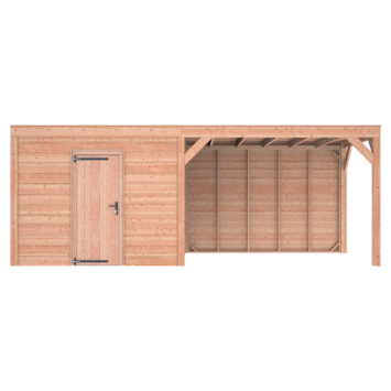 Dit modern vormgegeven tuinverblijf biedt een perfecte balans tussen uitstraling en functionaliteit. De totale afmetingen zijn 245 cm hoog, 645 cm breed en 255 cm diep. De berging heeft een breedte van 328,5 cm met een deur van 75cm x192,5cm.De overkapping heeft een breedte van 278,5 cm en een doorloophoogte van 224 cm.Of je nu een gezellige loungehoek, een opslagruimte of een overdekte plek voor tuinfeestjes zoekt, dit Douglas tuinverblijf is een aanwinst voor iedere tuin.Natuurlijke uitstraling, degelijke kwaliteit.De wanden zijn bekleed met Douglas Zweeds rabat en de constructie is gemaakt van onbehandeld Douglas met stevige staanders van 12x12cm.De keuze voor onbehandeld Douglas hout biedt een authentieke uitstraling en staat ook garant voor een lange levensduur.Functies:Door een overkapping mét opslag te kiezen, heb je een praktische ruimte om bijvoorbeeld tuingereedschap of fietsen op te slaan en af te sluiten, maar ook voor een ruimte om heerlijk beschut te ontspannen in uw eigen tuin. Het beste van 2 werelden!Klaar voor een groene toekomst:Dit modern vormgegeven tuinverblijf is speciaal ontworpen om zonnepanelen of een sedum dak te kunnen ondersteunen, Hierdoor is dit verblijf een duurzame en milieuvriendelijke aanvulling op uw tuin is.Zelf aan de slagDankzij de duidelijke opbouwomschrijving, meegeleverde bevestigingsmaterialen en op maat gezaagde onderdelen, is de installatie van dit tuinhuis een haalbare klus voor iedere gemiddelde doe-het-zelver. Dak bekleding:Wij raden aan om deze Douglas overkapping te voorzien van een EPDM Dak bekleding voor een lekvrij dak (Let op: los bij te bestellen).Onderhoud:Bij het kopen van een overkapping is onderhoud een aandachtspunt… Met Douglas hout heb je het goed voor elkaar, Douglas is namelijk van zichzelf al een sterke houtsoort. Het gaat zonder extra behandeling eenvoudig 10 tot 15 jaar mee. Om de maximale levensduur te verlengen kun je gebruik maken van speciale Douglas beits of Douglas olie en elke 2 jaar opnieuw beitsen of oliën.