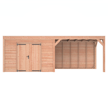 Dit modern vormgegeven tuinverblijf biedt een perfecte balans tussen uitstraling en functionaliteit. De totale afmetingen zijn 245 cm hoog, 695 cm breed en 255 cm diep. De berging heeft een breedte van 328,5 cm met een deur van 75cm x192,5cm.De overkapping heeft een breedte van 328,5 cm en een doorloophoogte van 224 cm.Of je nu een gezellige loungehoek, een opslagruimte of een overdekte plek voor tuinfeestjes zoekt, dit Douglas tuinverblijf is een aanwinst voor iedere tuin.Natuurlijke uitstraling, degelijke kwaliteit.De wanden zijn bekleed met Douglas Zweeds rabat en de constructie is gemaakt van onbehandeld Douglas met stevige staanders van 12x12cm.De keuze voor onbehandeld Douglas hout biedt een authentieke uitstraling en staat ook garant voor een lange levensduur.Functies:Door een overkapping mét opslag te kiezen, heb je een praktische ruimte om bijvoorbeeld tuingereedschap of fietsen op te slaan en af te sluiten, maar ook voor een ruimte om heerlijk beschut te ontspannen in uw eigen tuin. Het beste van 2 werelden!Klaar voor een groene toekomst:Dit modern vormgegeven tuinverblijf is speciaal ontworpen om zonnepanelen of een sedum dak te kunnen ondersteunen, Hierdoor is dit verblijf een duurzame en milieuvriendelijke aanvulling op uw tuin is.Zelf aan de slagDankzij de duidelijke opbouwomschrijving, meegeleverde bevestigingsmaterialen en op maat gezaagde onderdelen, is de installatie van dit tuinhuis een haalbare klus voor iedere gemiddelde doe-het-zelver. Dak bekleding:Wij raden aan om deze Douglas overkapping te voorzien van een EPDM Dak bekleding voor een lekvrij dak (Let op: los bij te bestellen).Onderhoud:Bij het kopen van een overkapping is onderhoud een aandachtspunt… Met Douglas hout heb je het goed voor elkaar, Douglas is namelijk van zichzelf al een sterke houtsoort. Het gaat zonder extra behandeling eenvoudig 10 tot 15 jaar mee. Om de maximale levensduur te verlengen kun je gebruik maken van speciale Douglas beits of Douglas olie en elke 2 jaar opnieuw beitsen of oliën.