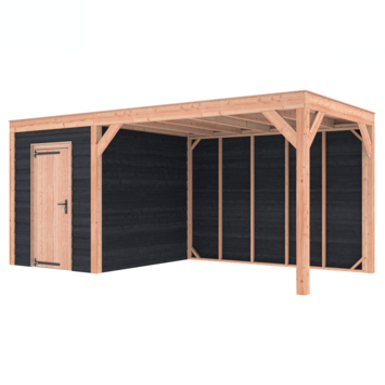 Dit modern vormgegeven tuinverblijf biedt een perfecte balans tussen uitstraling en functionaliteit. De totale afmetingen zijn 245 cm hoog, 545 cm breed en 255 cm diep. De berging heeft een breedte van 328,5 cm met een deur van 75cm x192,5cm.De overkapping heeft een breedte van 178,5 cm en een doorloophoogte van 224 cm.Of je nu een gezellige loungehoek, een opslagruimte of een overdekte plek voor tuinfeestjes zoekt, dit Douglas tuinverblijf is een aanwinst voor iedere tuin.Natuurlijke uitstraling, degelijke kwaliteit.De wanden zijn bekleed met Zwart Zweeds rabat en de constructie is gemaakt van onbehandeld Douglas met stevige staanders van 12x12cm.De keuze voor onbehandeld Douglas hout biedt een authentieke uitstraling en staat ook garant voor een lange levensduur.Functies:Door een overkapping mét opslag te kiezen, heb je een praktische ruimte om bijvoorbeeld tuingereedschap of fietsen op te slaan en af te sluiten, maar ook voor een ruimte om heerlijk beschut te ontspannen in uw eigen tuin. Het beste van 2 werelden!Klaar voor een groene toekomst:Dit modern vormgegeven tuinverblijf is speciaal ontworpen om zonnepanelen of een sedum dak te kunnen ondersteunen, Hierdoor is dit verblijf een duurzame en milieuvriendelijke aanvulling op uw tuin is.Zelf aan de slagDankzij de duidelijke opbouwomschrijving, meegeleverde bevestigingsmaterialen en op maat gezaagde onderdelen, is de installatie van dit tuinhuis een haalbare klus voor iedere gemiddelde doe-het-zelver. Dak bekleding:Wij raden aan om deze Douglas overkapping te voorzien van een EPDM Dak bekleding voor een lekvrij dak (Let op: los bij te bestellen).Onderhoud:Bij het kopen van een overkapping is onderhoud een aandachtspunt… Met Douglas hout heb je het goed voor elkaar, Douglas is namelijk van zichzelf al een sterke houtsoort. Het gaat zonder extra behandeling eenvoudig 10 tot 15 jaar mee. Om de maximale levensduur te verlengen kun je gebruik maken van speciale Douglas beits of Douglas olie en elke 2 jaar opnieuw beitsen of oliën.